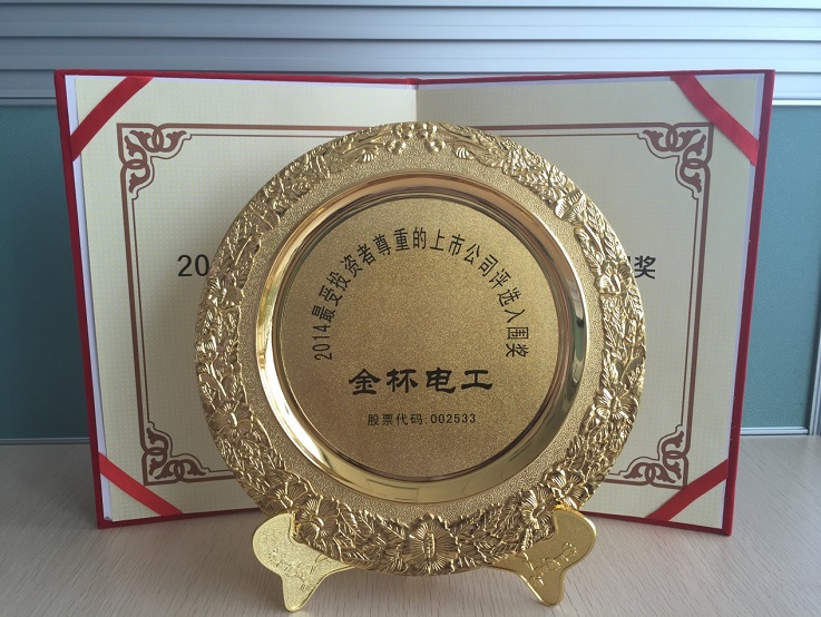 “2014年度最受投資者尊重的上市公司評選活動”由中國上市公司協(xié)會、中國證券投資者保護(hù)基金公司主辦,中國證券業(yè)協(xié)會、中國證券投資基金業(yè)協(xié)會承辦,于2014年10月28日啟動,通過上市公司自薦和投資者推薦的方式進(jìn)行評選,并依照上市公司近三年的綜合業(yè)績排名產(chǎn)生入圍企業(yè),金杯電工榮獲“2014年度最受投資者尊重的上市公司評選入圍獎”。