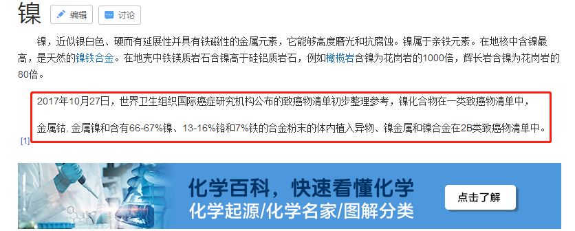 百度百科:2017年10月27日,世界衛(wèi)生組織國際癌癥研究機構公布的致癌物清單初步整理參考,鎳化合物在一類致癌物清單中,金屬鈷, 金屬鎳和含有66-67%鎳、13-16%鉻和7%鐵的合金粉末的體內植入異物、鎳金屬和鎳合金在2B類致癌物清單中。